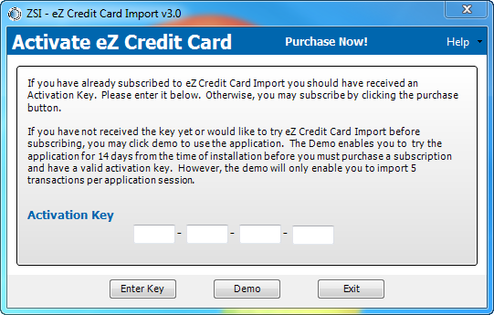 16 character key that unlocks eZ Credit Card Import for unlimited uses during an annual subscription. |
