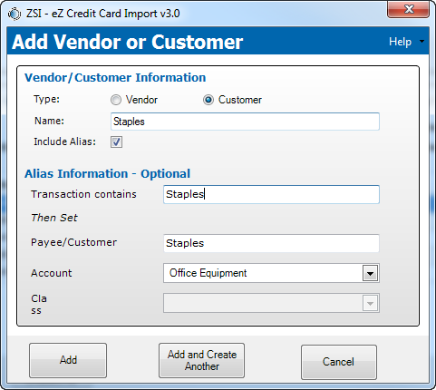 The Add QuickBooks® Vendor or Customer window enables users to add a new vendor or customer to QuickBooks®. Optionally, users may add an alias while adding a new vendor.