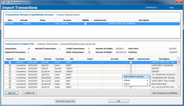 2. In the Transactions in Import File, right-click anywhere on the row that contains a transaction for which a new vendor/customer needs to be created. A pop-up menu displays: