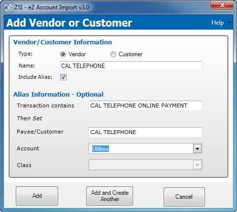 Adding a vendor or customer enables you to create additional customers and vendors in your accounting schematic. In addition to creating a new vendor or customer with which your company interfaces, you may also create an Alias for the vendor or customer at the same time. Creating Aliases enables you create easy and recognizable names commonly utilized by your company. When the application reads an online banking export file and an alias is encountered, a pre-defined payee and account is automatically pre-populated in the Review Transactions window