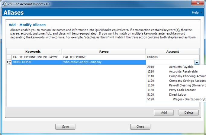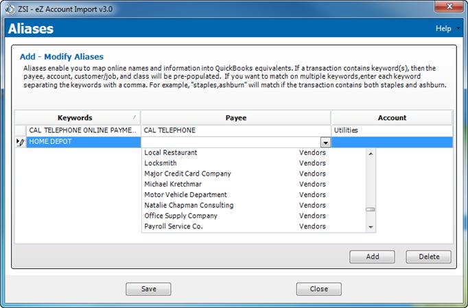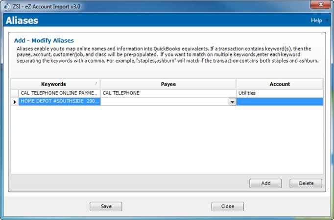 12. If you want to add more aliases, click Add. Enter the Keyword, Payee and Account for each additional Alias.
