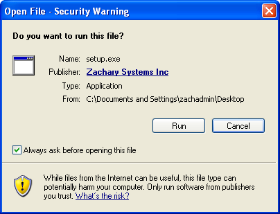 9. Navigate to your desktop. Double-click on setup.exe. An Open File – Security Warning dialog box opens:
