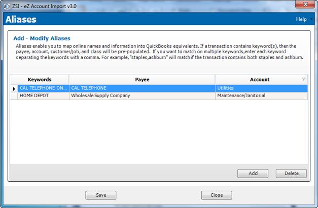 Once aliases are created, there may be a need to modify them. Once modified, the pre-defined payee or account will populate in eZ Account Import during future uses of the application.