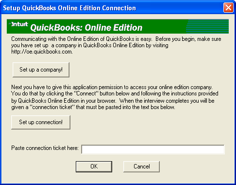 1. Select QuickBooks® Online Edition and click Access QuickBooks®. The Setup QuickBooks Online Edition Connection opens. Click the Setup Connection button..