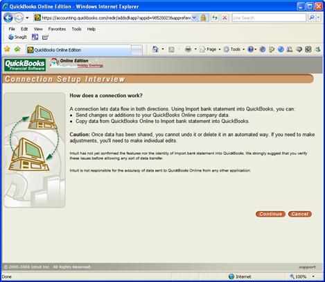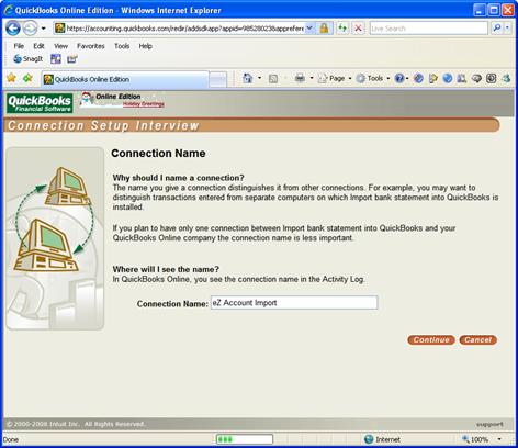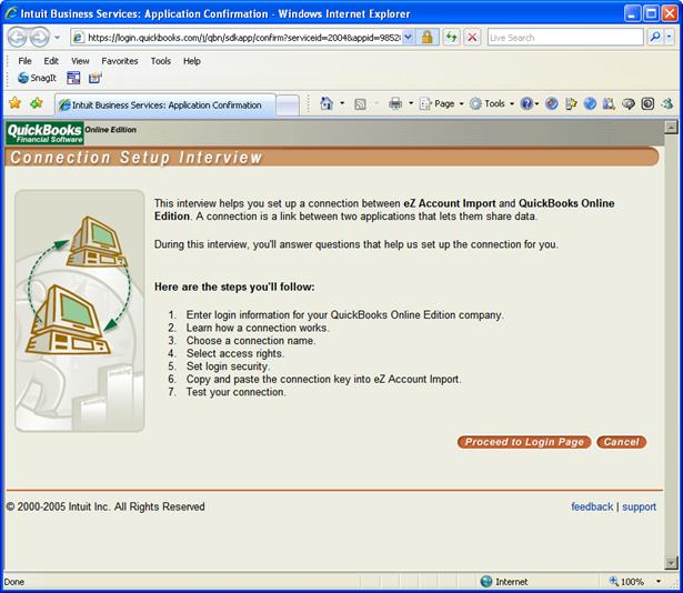 2. Click the Set up Connection! Button and a browser window will be launched directing you to the QuickBooks Online Edition and the setup steps required to establish a connection for eZ Account Import.