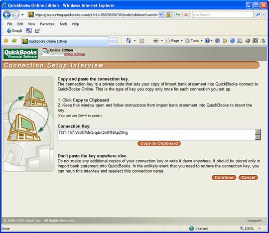 10. Click Copy to Clipboard link. Then return to Setup QuickBooks Online Edition Connection window. Put your cursor in the Past connection ticket here text entry, right click your mouse and select past. The connection ticket should be displayed in the text entry. If not return to the Connection Key and be sure to copy to your clipboard and repeat the procedure.