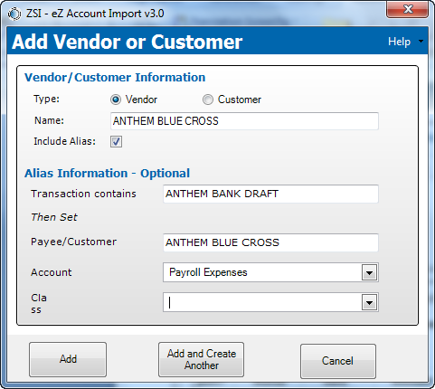 The Add QuickBooks® Vendor or Customer window enables users to add a new vendor or customer to QuickBooks®. Optionally, users may add an alias while adding a new vendor.