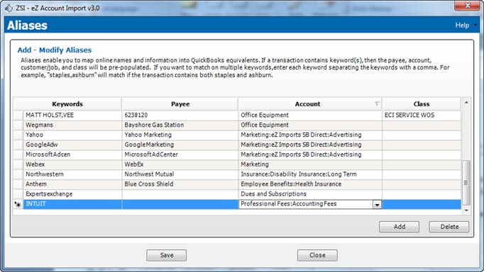 By creating aliases, users are not required to have a one-for-one match between online transaction descriptions and payees within their accounting software. Utilizing aliases also eliminates the possible issues faced when vendors add transaction identifiers, such as store number or date, to transactions.