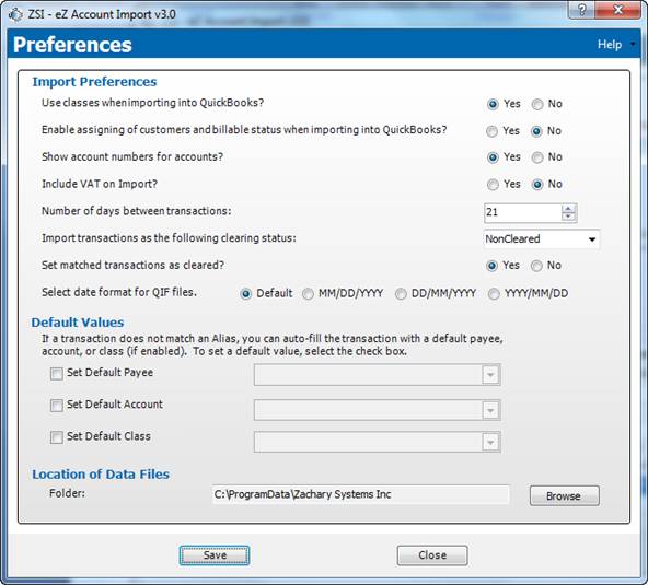The Preferences window enables the user to set some default behaviors during the review and import of transaction information.