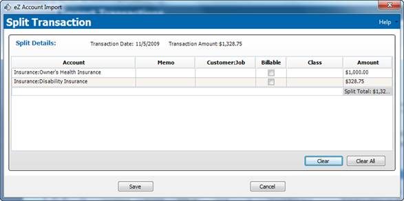 Enter the split details by selecting/entering the Account, Billable Status, CustomerJob, Memo and Amount in a row for each split item. To add a new row to the split press the Tab key when in the amount column.